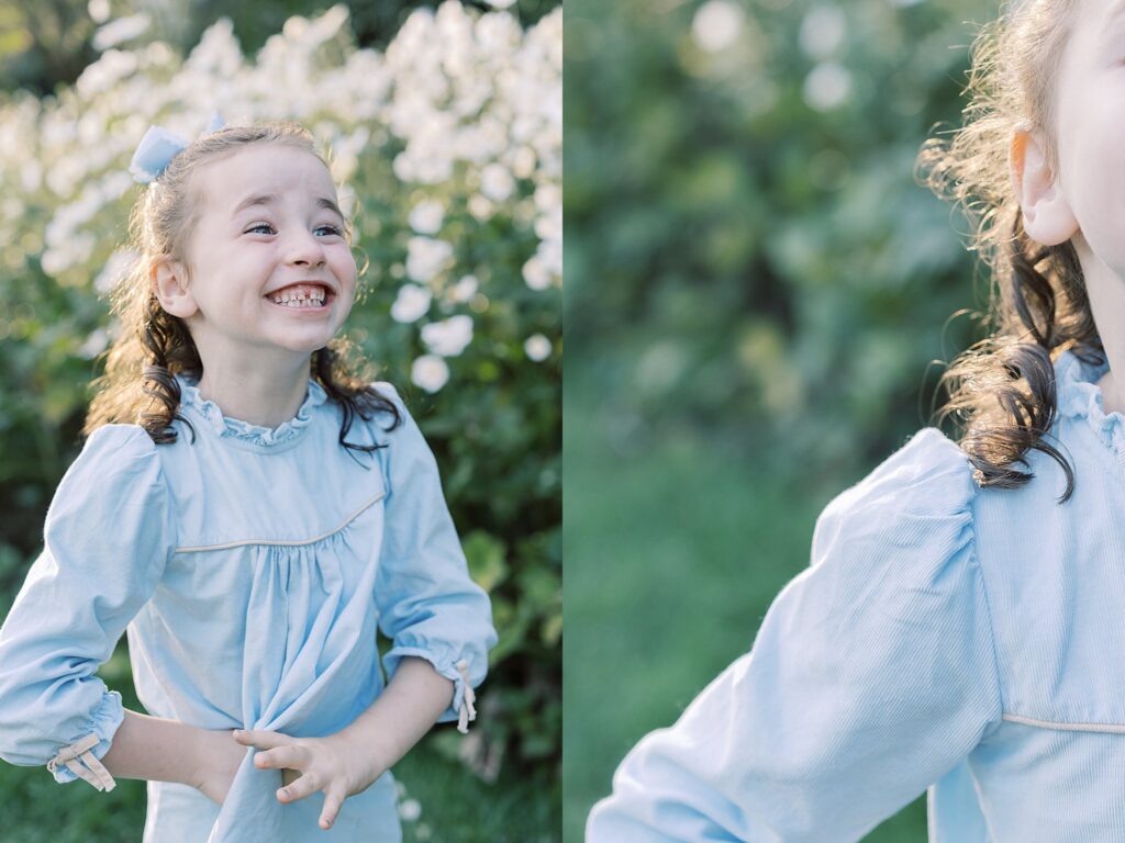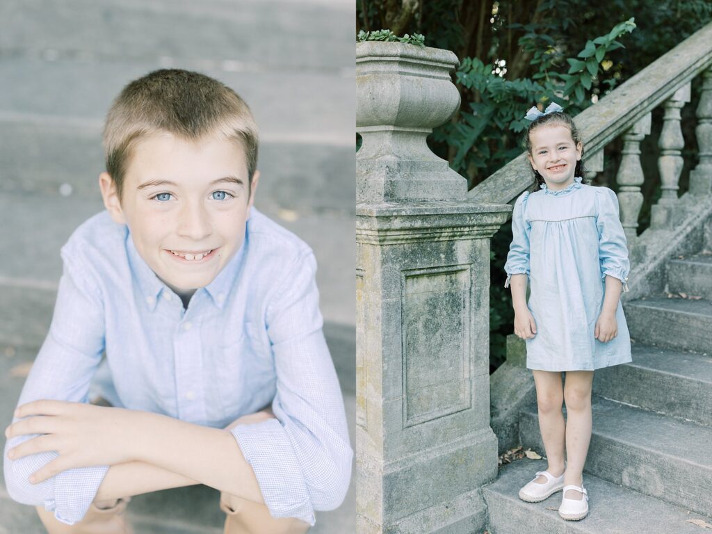 These Family Photos in Bishop’s Garden felt so dreamy. I love how the garden offers a mix of fauna, flowers and architecture. My client chose the perfect outfits to match with hues of blue and green. The mother’s dress is from Tuckernuck and I have found that they have so many lovely options for family photos.